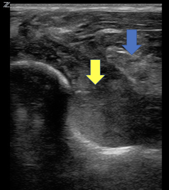 Cotovelo direito: ruptura da linha hiperecoica que representa o córtex supracondilar (seta vermelha). Líquido misto hipoecoico e hiperecóico superficial ao córtex representando hemolipoartrose (seta amarela). Protuberância do coxim adiposo posterior além da linha umeral (seta azul).