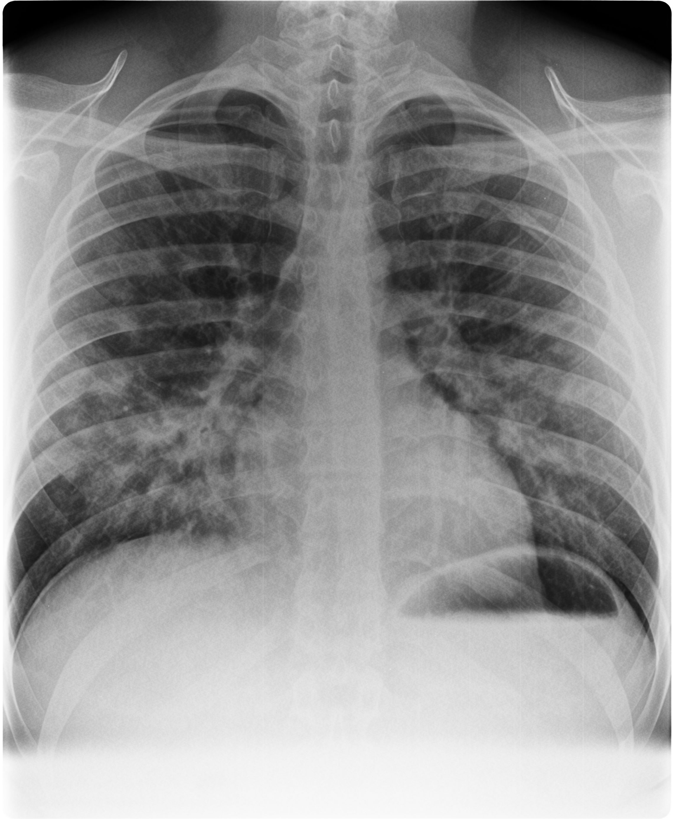 Day 1 after of presentation, Patchy interstitial infiltrates in R middle lobe