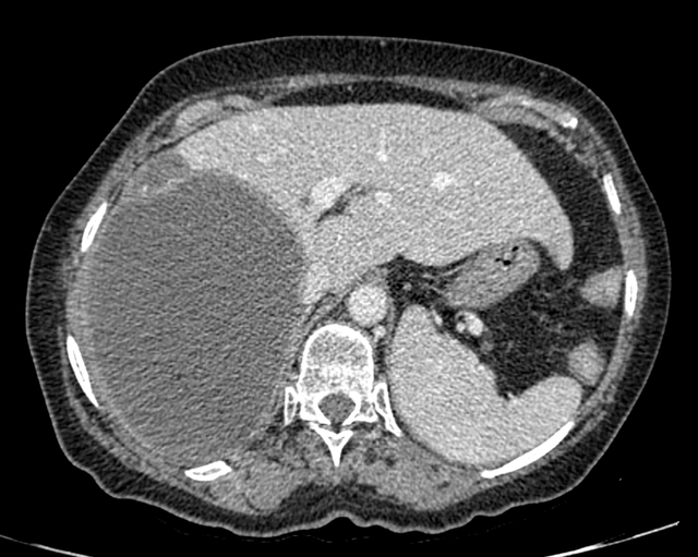 CT of the abdomen/pelvis shows a circumscribed multilocular cystic lesion containing multiple smaller cysts in the right hepatic lobe associated with bulging of the capsule.
